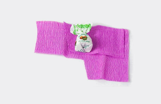 A seguir, embrulhe um bombom ou uma trufa com esse pedaço de papel crepom.