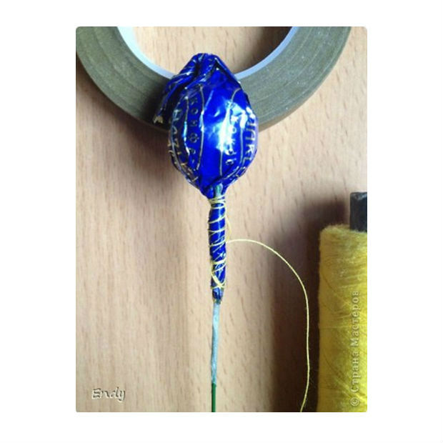 Para facilitar o seu trabalho, aproveite para encaixar também o arame floral, que deverá ser embrulhado junto com o doce.